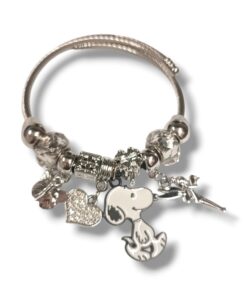 Hermosa pulsera Snoopy con brillitos y destellos de ternura en color Plateado , viene en una linda bolsita de terciopelo, lista para regalar